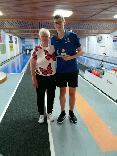 Rudi Braun hielt anschließen einen kleinen Rückblick über das K&B Trainingslager. Sein Dank galt dabei allen Teilnehmern für ihr Engagement, sowie an Mathias Weber, der die Durchführung übernahm.Besonders bedankte er sich bei der Fa. K&B für die große Unterstützung. Anschließend wurden die Ehrungen des Vereins durchgeführt. Dabei wurden zahlreiche Spieler mit der Verdienst Medaille der Chambtalkegler für außergewöhnliche sportliche Erfolge ausgezeichnet. (Bild rechts zeigt die Ehrenpräsidentin des BSKV Margot Petzel, die an Jugendspieler Luca Diermeier den kleinen Diamanten überreichte)