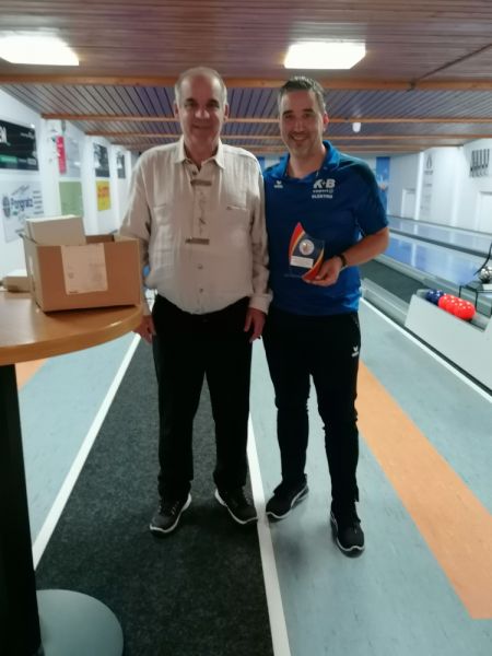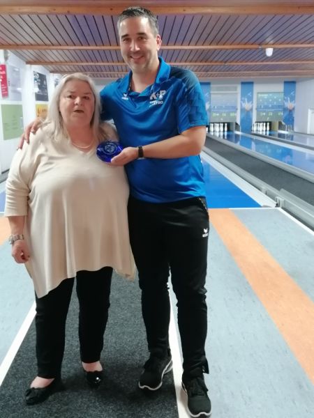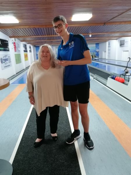 Der Schwerpunkt des K&B Trainingslager lag zunächst im sportlichen Bereich. Beim Start am Donnerstag stand ein volles Training auf dem Programm. Am Freitag folgte ein weiteres Trainingsprogramm. Am Abend wurde dann ein Freundschaftsspiel gegen das Bayernligateam des SKK Neukirchen hl. Blut abgehalten. Beim 7:1 Sieg mit 3620:3310 Kegeln spielten Daniel Schmid – Markus Pfeiffer 4:0 und 588:512 Kegeln, Mathias Weber – Martin Kräh 2:2 und 574:606 Kegeln, Luca Diermeier – Franz Weiß 3:1 und 605:530 Kegeln, Milan Svoboda – Lukas Hofmann 4:0 und 641:568 Kegeln, Pointinger Jürgen – Tobias Schwarz 3:1 und 588:563 Kegeln und Taras Elsinger – Manuel Donhauser 4:0 und 624:531 Kegeln. (Bild links zeigt die Ehrenpräsidentin des BSKV, die an Mathias Weber den blauen Diamanten überreichte)