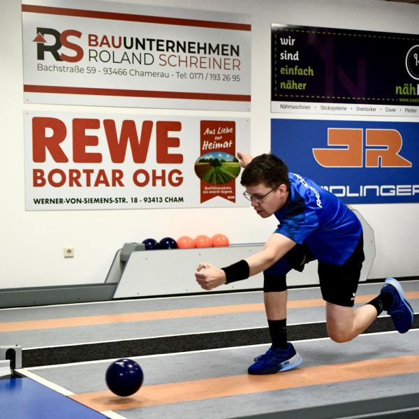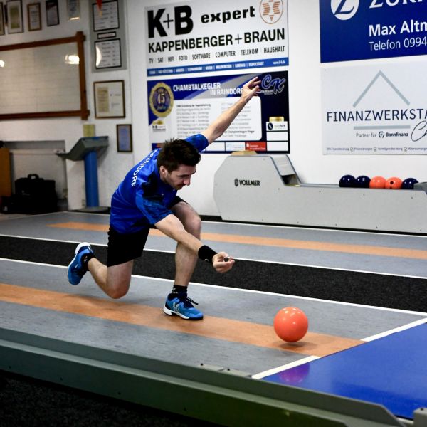 Für das Chambtalerteam gingen Mathias Weber und Daniel Schmid an den Start. Weber lieferte sich gegen den polnischen Nationalspieler Mikolaj Konopka ein Duell auf Augenhöhe. Jedoch hatte der Raindorfer Mannschaftskapitän in den ersten drei Sätzen nicht das Glück auf seiner Seite. Mit 162:166, 163:168 und 160:165 Kegeln zog er hier den Kürzeren, so dass er das Duell schon verloren hatte. Weber zeigte jedoch Moral und konnte den letzten Satz mit 181:155 Kegeln für sich entscheiden. Obwohl er mit 666:654 mehr Kegeln spielte, musste er mit 1:3 den Mannschaftspunkt abgeben. Daniel Schmid kam gegen den slowakischen Nationalspieler Tibor Varga sehr gut ins Spiel und gewann den ersten Satz deutlich mit 193:142 Kegeln. Zwar musste er den zweiten Satz mit 155:159 Kegeln knapp abgeben, doch mit 161:154 und 160:156 Kegeln gingen die Nächsten beiden Sätze wieder an Schmid. Mit 3:1 und 669:611 Kegeln holte er den ersten Mannschaftspunkt für das Chambtalerteam. Mit einem Spielstand von 1:1 und 1335:1265 (+70) Kegeln, sowie 4:4 Satzpunkten war das Chambtalerteam sehr gut im Rennen.(Bild links zeigt Daniel Schmid, der beim Start mit einer starken Leistung den Mannschaftspunkt holte)