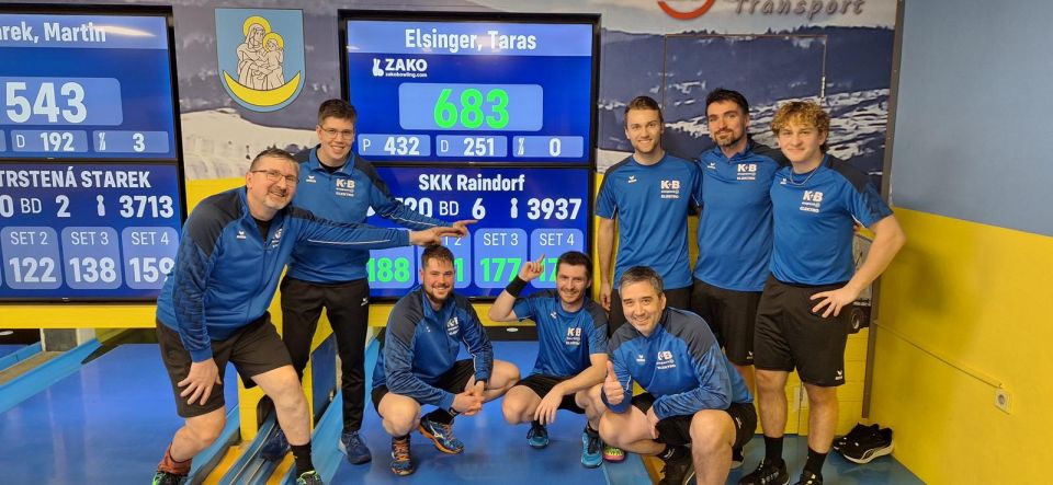 141:122 Kegeln für sich entscheiden. Anschließend kam ab Wurf 61 Taras Elsinger für Pointinger ins Spiel. Auch Elsinger zeigte eine souveräne Leistung und gewann mit 177:138 und 177:159 Kegeln seine beiden Sätze. Mit 4:0 und der gemeinsamen Tagesbestleistung von 683:543 Kegeln ging hier der Mannschaftspunkt an Raindorf. Parallel kämpfte Michael Kotal gegen Martin Kozak und gewann die ersten beiden Sätze mit 169:141 und 171:147 Kegeln. Anschließend wurde nochmals durch gewechselt. Für Kotal kam nach Wurf 60 Elias Hollmeier ins Spiel und bei den Gastgebern für spielte für Koznak die letzten 60 Wurf Daniel Pazitny. Hier zog der Raindorfer mit 132:142 und 138:152 Kegeln den Kürzeren. Trotzdem konnte Kotal/Hollmeier mit 2:2 und 610:582 Kegeln den Mannschaftspunkt für Raindorf holen. Am Ende führte das Weber-Team mit 4:2 Mannschaftspunkten. Mit einem Gesamtergebnis von 3937:3713 Kegeln erhielt man auch die beiden Kegelpunkte, so dass man mit 6:2 auch das Rückspiel gewann. (Jürgen Pointinger (rechts) und Taras Elsinger (links) spielten zusammen die Tagesbestleistung)